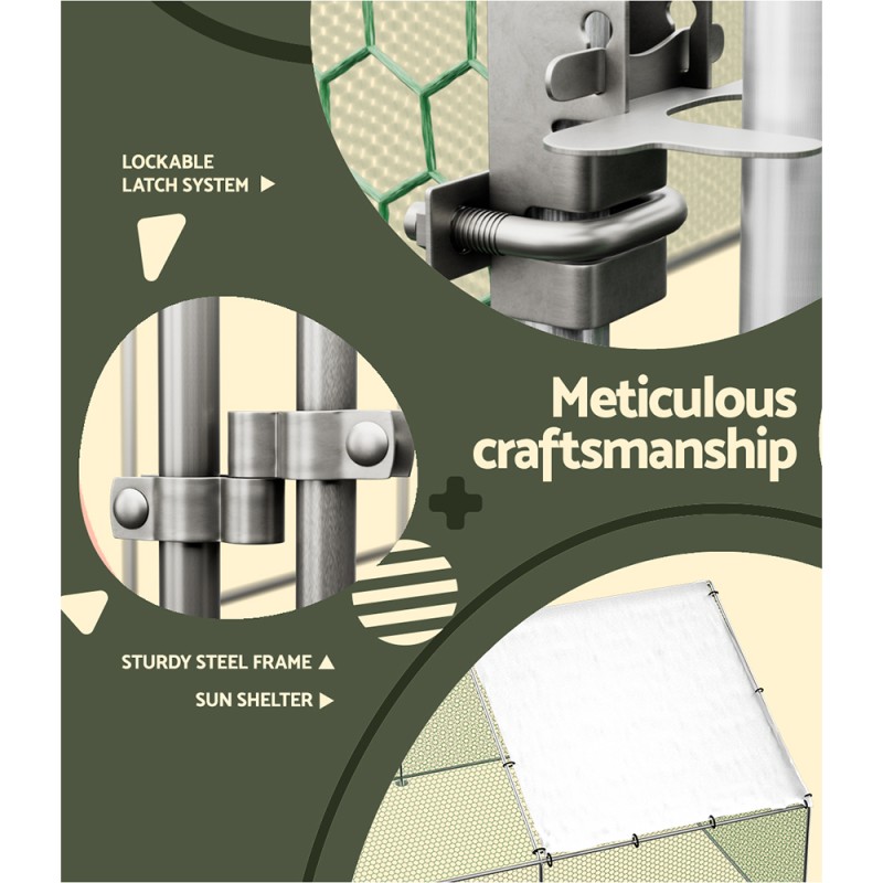 Give your beloved pets a safe and comfortable home with the i.Pet Chicken Coop Cage. Designed with a spacious area for movement, it ensures your chickens, geese, or ducks never feel trapped. Constructed from galvanised steel, this durable coop features wire sidewalls for ventilation and a weather-resistant roof for protection. With a large entrance and lockable system, it's easy to access and secure. Assembly is simple, and it comes with a 1-year warranty.