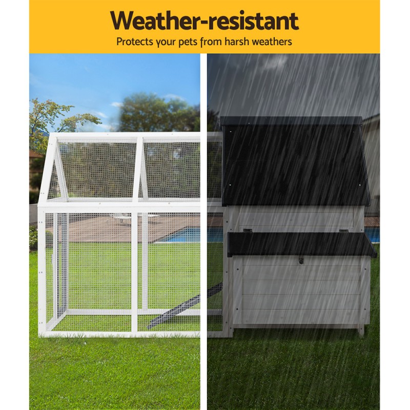 Give your beloved pets a safe and comfortable home to sleep, rest, play, and relax with the i.Pet Chicken Coop Rabbit Hutch. Designed for smaller pets like rabbits, chickens, guinea pigs, and more, this hutch is crafted from solid fir wood and galvanised mesh for long-lasting durability. Its black asphalt felt roof protects against weather extremes, while the spacious play area ensures endless outdoor fun. Featuring a foldable ramp, hatching box, and slide-out tray, this hutch promises convenience and joy for your pets and you.