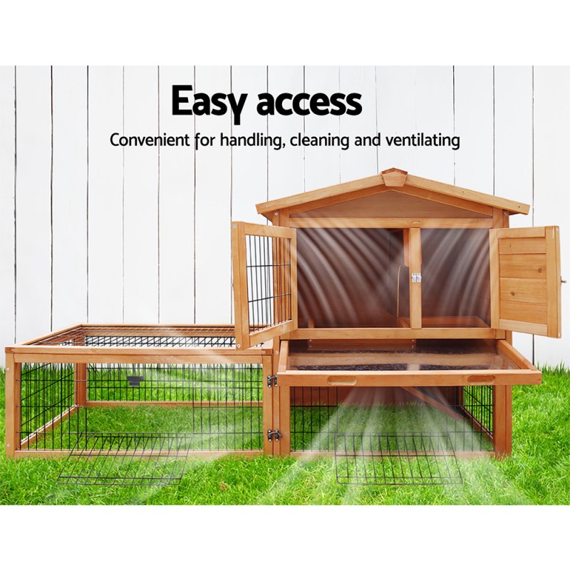 Give your pets the home they deserve with the i.Pet Chicken Coop, a spacious and durable outdoor haven. Crafted from high-quality Fir wood and steel mesh wire, this coop offers a secure environment with an open floor for grazing. The two-level design includes a cosy enclosed bedroom and a large play area, connected by a sturdy ramp. With an asphalt roof for weather protection and four lockable doors for easy access and cleaning, it's the ideal retreat for rabbits, guinea pigs, or ferrets. Treat your furry friends to comfort and safety today!