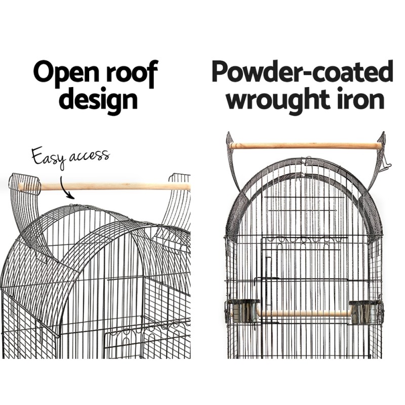 The i.Pet Bird Cage is a luxurious 150cm large aviary designed for your cherished feathered companions. Crafted from high-quality, powder-coated wrought iron, this elegant cage features a spacious dome shape with an open roof design. It includes a large access door, two small side windows for effortless feeding with stainless steel feeders, and two timber perches. Easy maintenance is ensured with a slide-out tray, while castor wheels offer smooth mobility. Its anti-rust finish and net under storage space add to its practicality and style.
