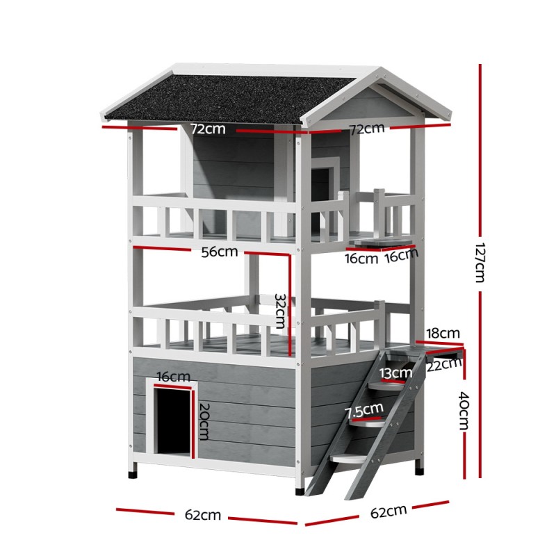 Gift your pets a fun and functional playhouse with the i.Pet Cat House Outdoor Shelter. Perfect for both outdoor and indoor use, this pet hutch is crafted from durable fir wood and features a weather-resistant asphalt roof. It offers three tiers with spacious enclosures, a step ladder, and patios for your pets to explore. Designed for small pets like cats, puppies, and rabbits, it encourages natural jumping instincts. Easy to clean and assemble, the hutch ensures comfort and safety for your furry companions.