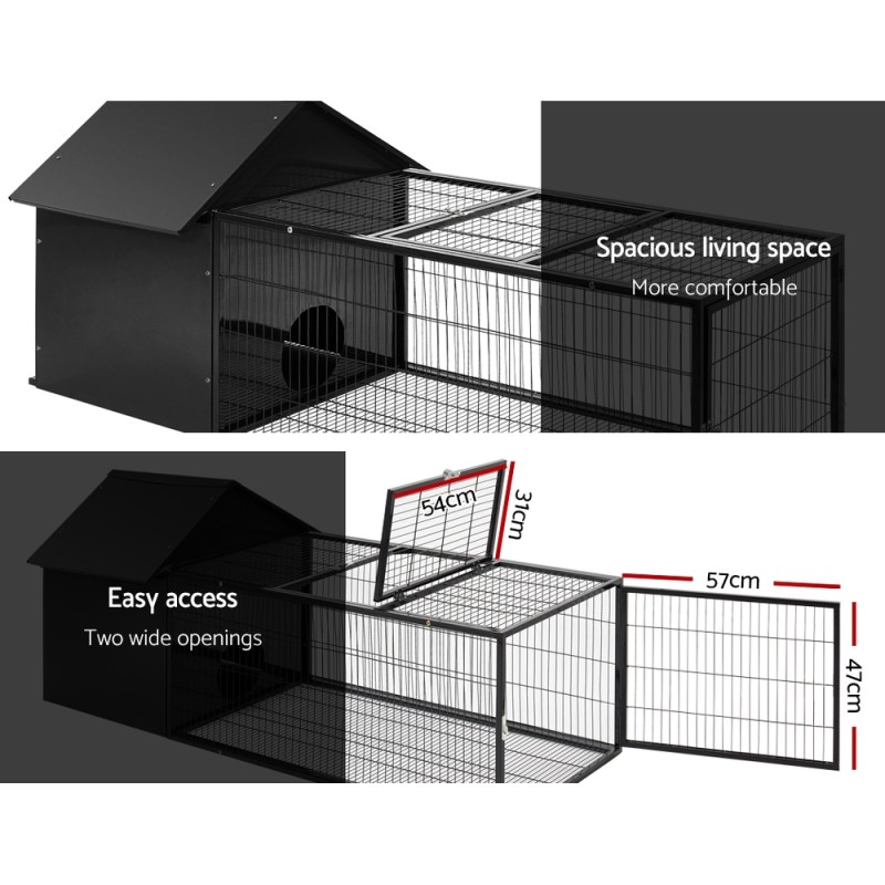 The i.Pet Rabbit Cage Hutch offers a cosy home and private exercise space for rabbits, guinea pigs, chinchillas, and other small pets. Featuring a pitch-roof enclosed shelter with a 20cm diameter slot for easy access, it includes a slide-out mesh tray for effortless cleaning. The weatherproof metal cage provides ample room for exercise and fresh air, with lockable openings for security. Built with a chew-proof metal frame, this hutch ensures a safe and enjoyable environment for your pets.
