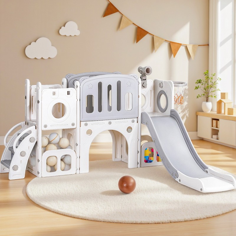 Keep your kids active and entertained with the Keezi 3-in-1 Kids Slide Swing Set Ball Hoop Rings Football Outdoor Toys. Featuring a wide platform, fun telescope, and dual ladder, this versatile play centre is crafted from premium HDPE in stylish grey and white for durability and safety. Anti-slip steps, safe grip handles, and ample bottom toy storage add to the fun and functionality. Simple to assemble, it's perfect for indoor or outdoor play. Includes one ball and ring. Adult supervision required.
