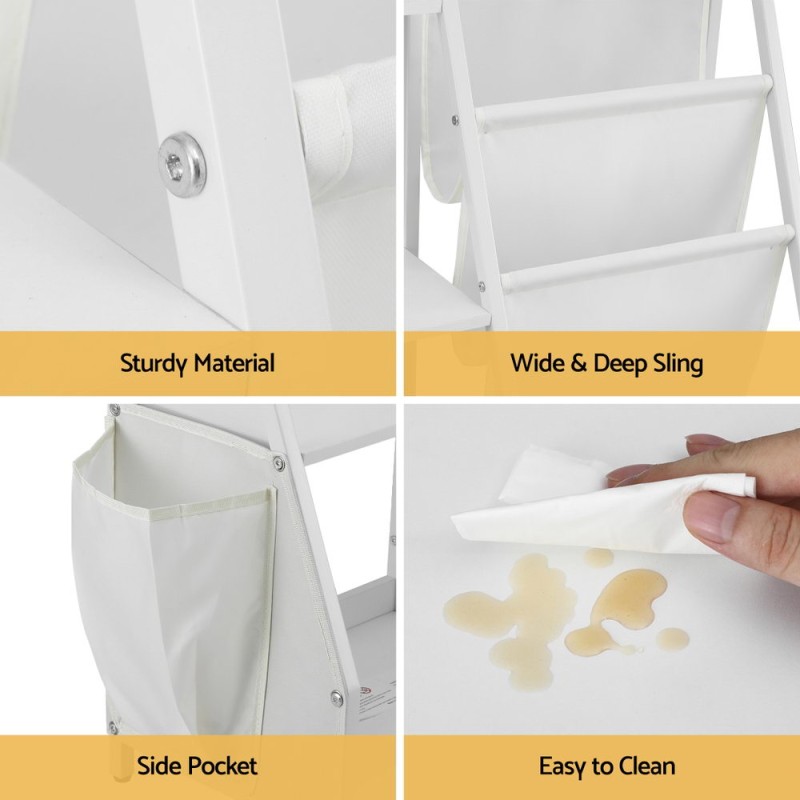 Transform your child's space into an organised haven with the Keezi 3-Tier Kids Bookshelf Bookcase. Perfect for bedrooms or playrooms, this smart storage solution features a blend of open shelves and sling-style book racks, making it easy for little ones to access their favourite toys and books. The bookshelf stands at a child-friendly height with safety-enhancing rounded edges and an anti-tipping kit. Crafted from water-resistant PB melamine with a robust metal frame, it promises durability and easy cleaning. A handy fabric pocket provides extra storage for smaller items. Assembly is a breeze with included hardware. Suitable for ages 3+, this stylish white bookshelf supports tidying habits and daily use.