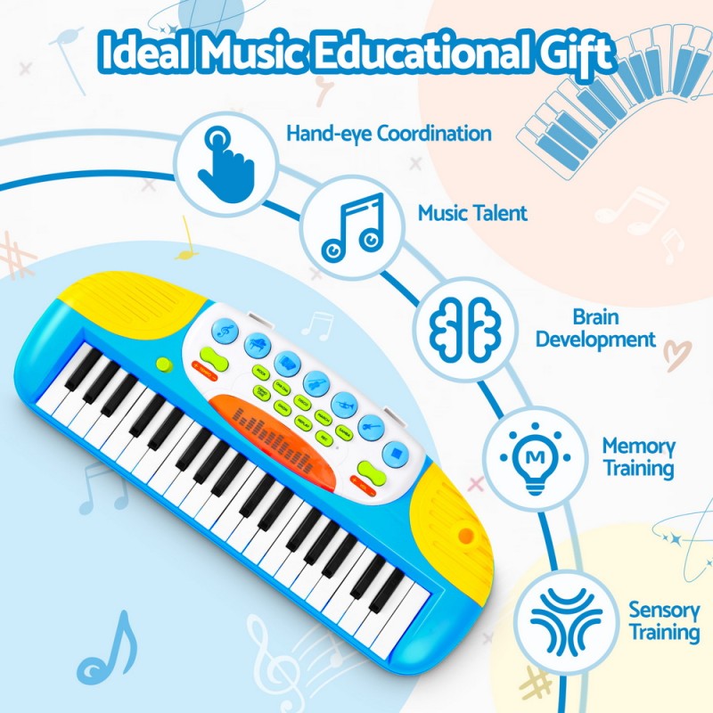 Unleash the little Mozart within with the Keezi 37-Key Kids Piano Keyboard, an all-in-one set designed to inspire young musicians aged 3+. This vibrant musical instrument set includes a table and chair, 5 rhythmic beats, 5 instrument sounds, and 10 demo songs to explore. Budding musicians can record their first compositions with the playback function, sing along using the adjustable microphone, and follow the engaging LED lights. With a detachable music stand and easy tempo/volume control, it’s the perfect introduction to music, fostering creativity and joy. Designed with MP3, microphone, and transformer ports for endless fun, this set promises a lifelong love of music.