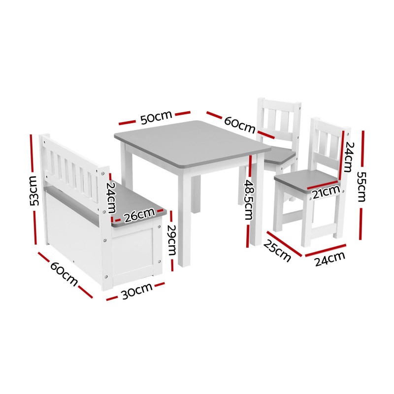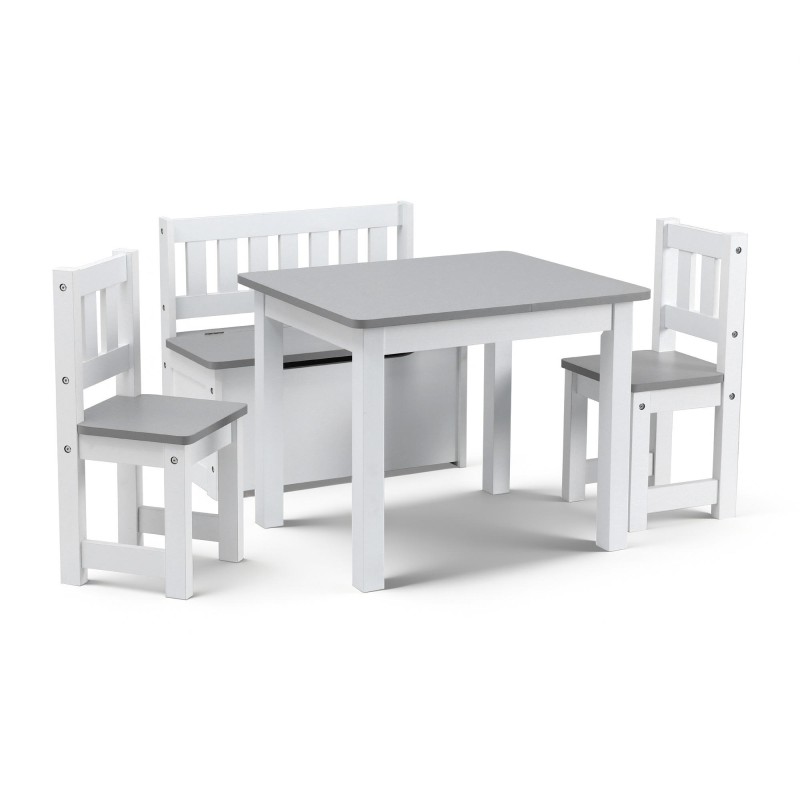 - 4-piece set – Includes a table, two chairs, and a storage bench.
