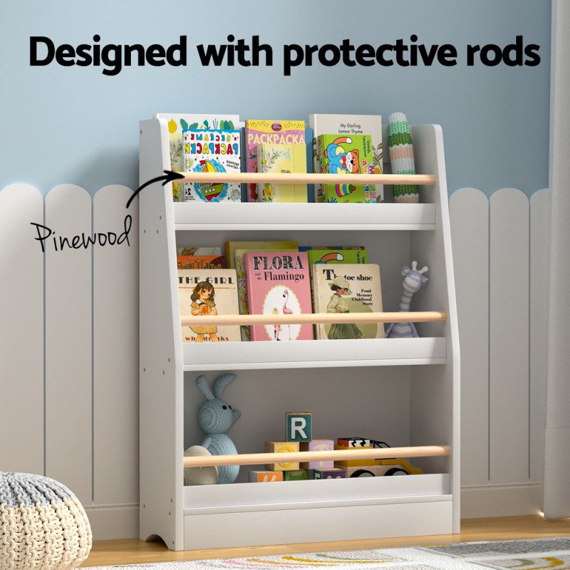 The Keezi Kids Bookshelf is a stylish and practical 3-tier storage solution perfect for organising your child's books and toys. Designed for children aged three and above, this versatile bookcase is ideal for playrooms, living rooms, and kindergartens. Protective rods secure items, preventing falls, while smooth edges ensure safety. This bookshelf is easy to assemble, clean, and maintain, with an optional wall attachment for extra stability. Keep your child's belongings tidy and accessible with Keezi.