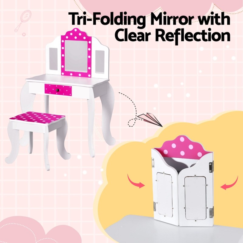 Introducing the Keezi Kids Dressing Table Vanity Makeup Chair Set in Pink, a perfect blend of safety and style for your little one's room. Crafted from high-quality MDF, this set features rounded corners and easy-to-clean surfaces, making it both practical and child-friendly. The set includes a charming dressing table with a three-panel folding mirror and a drawer for storage, along with a sturdy chair. Designed with strong curved legs, it ensures durability and elegance in any space.