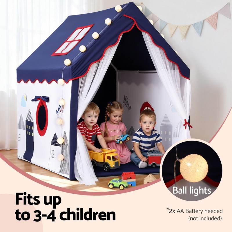 Unleash your child's imagination with the Keezi Kids Play Tent Playhouse Castle. This spacious tent comfortably accommodates 3β4 kids, offering a magical space for reading, napping, and playing. Crafted from durable polyester fabric and supported by sturdy PVC poles, it's perfect for both indoor and outdoor adventures. The breathable mesh curtains ensure excellent ventilation and easy supervision. Adorned with enchanting string ball lights, this tent transforms any room into a dreamy castle. Easy to clean and maintain, itβs an ideal gift for children aged 3 and up, promising endless hours of fun and creativity.