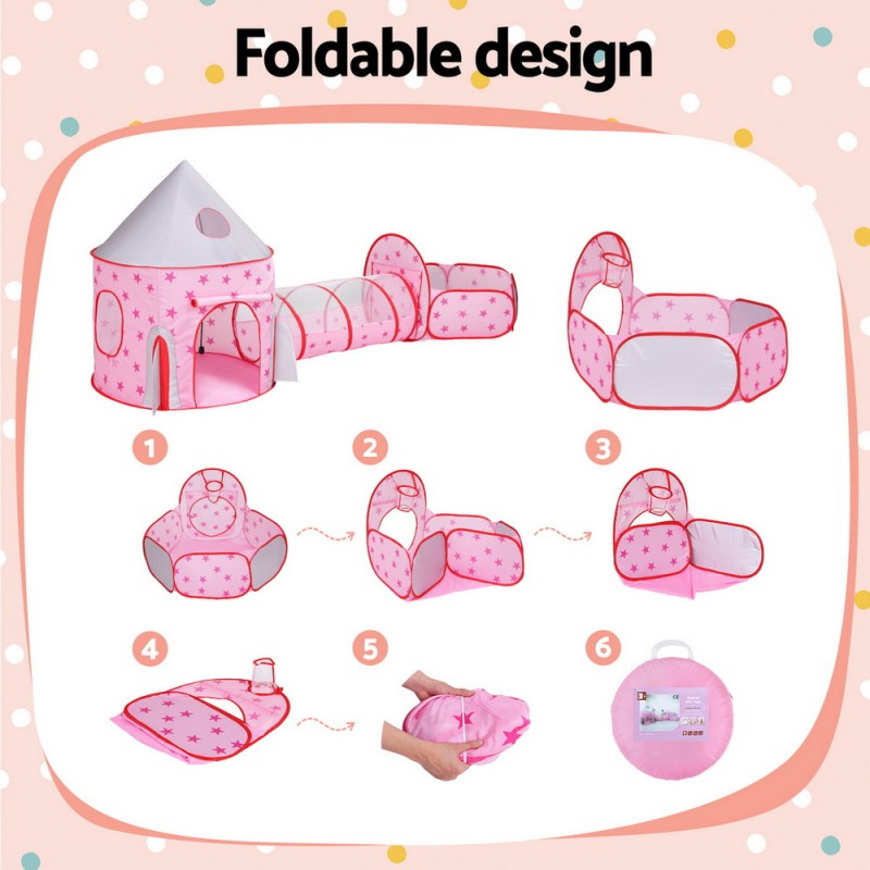 Inspire endless fun and creativity with the Keezi Kids 3-in-1 Playhouse! Featuring a whimsical pink castle, crawl tunnel, and ball pit with a basketball hoop, this foldable play tent is perfect for imaginative play both indoors and outdoors. Made from durable 190T polyester fabric, it’s easy to set up, clean, and store in the handy carry bag. With breathable mesh windows and a roller shutter door, your child will love discovering, hiding, and playing in their own magical world. Certified to EN71 safety standards, it’s ideal for kids aged 3 and up.