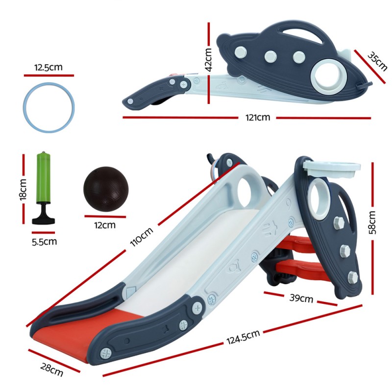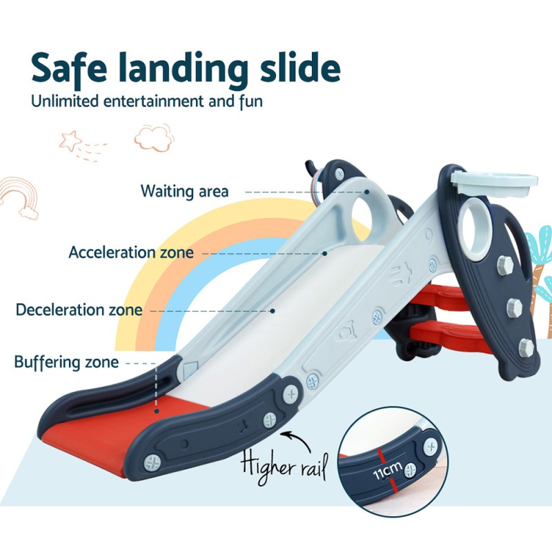 Unleash endless fun and physical activity with the Keezi Kids Slide Set! This 3-in-1 playground marvel features a long slide, a basketball hoop, and a ring game, complete with a bonus ball and pump. Made from durable, high-density non-toxic material, its triangle force structure and non-slip gasket design ensure safety and stability. With wide, gapless steps, safe grip handles, and a foldable design, it's perfect for indoor and outdoor play. Easy to assemble and AS8124 approved, it's the ideal gift for your little ones!