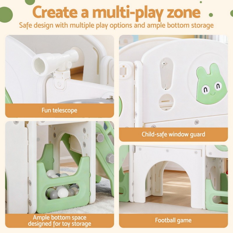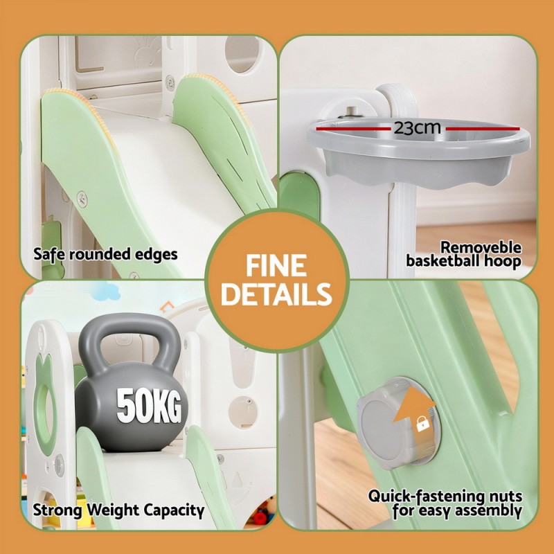 Unleash the joy of active play with the Keezi Kids Slide Swing Set Ball Hoop Rings Football Outdoor Toys in Green. This versatile 3-in-1 play set is designed to keep your little ones entertained for hours. Featuring a dual wide platform and a fun telescope, it's crafted from premium HDPE in a chic grey and white finish. Safety is paramount with anti-slip steps, safe grip handles, and ample bottom space for toy storage. A ball and ring are included for added fun, and the set is easy to assemble. Perfect for both indoor and outdoor use, this play set promises endless fun. Please ensure adult supervision while using the swing.