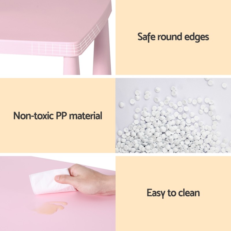 Brighten up your child's playroom or study area with the Keezi Kids Table and 2 Chairs Set in charming pink. Crafted from non-toxic, durable PP material, this set is safe, sturdy, and easy to clean, perfect for children aged 3 and above. With smooth, rounded edges and a robust design supporting up to 50kg per seat or table, it's ideal for crafts, homework, or snack time. Assembly is simple, and the set comes with a 1-year warranty for peace of mind.