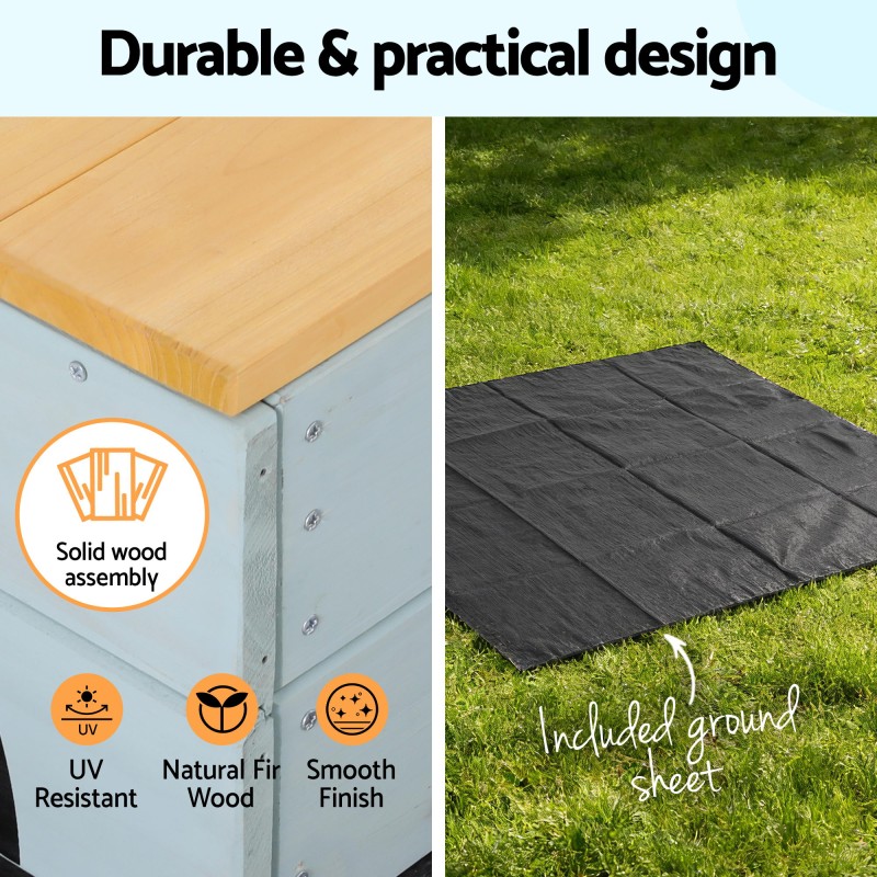 Rev up backyard fun with the Keezi Wooden Car Sandpit, a 120cm multicoloured sandbox shaped like a car with painted headlights and tyres, a bright red rotatable steering wheel and roomy bench seats. Made from solid wood with plastic components and supplied with a PE ground sheet this sandpit includes a handy bonnet storage compartment to keep toys tidy while promoting imaginative role play and fine motor development for young children.