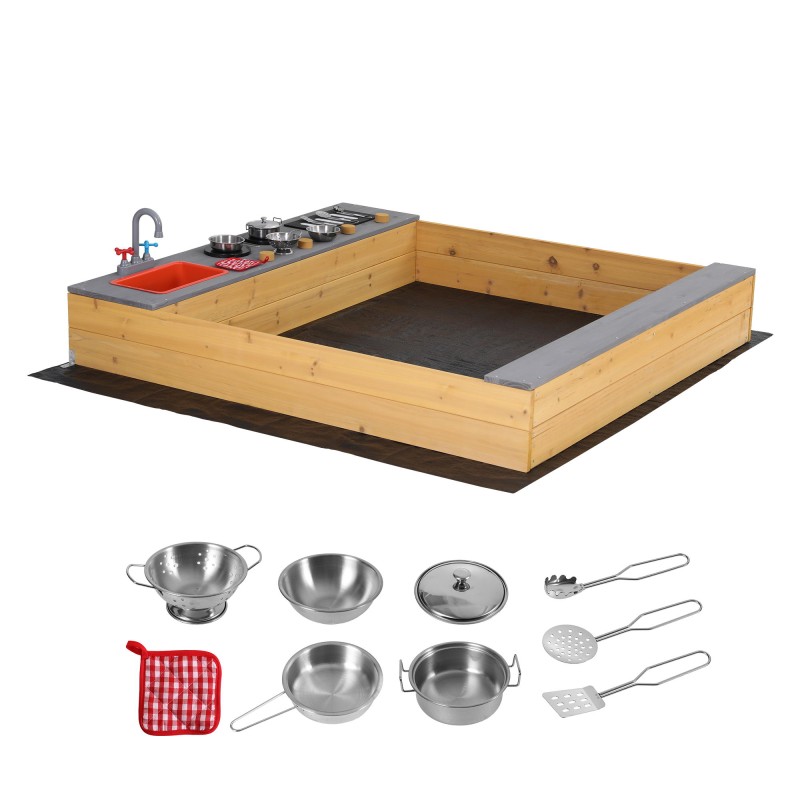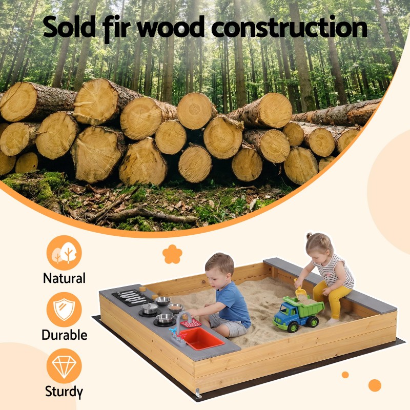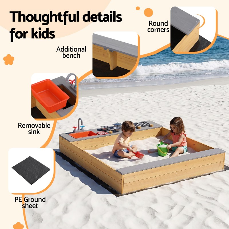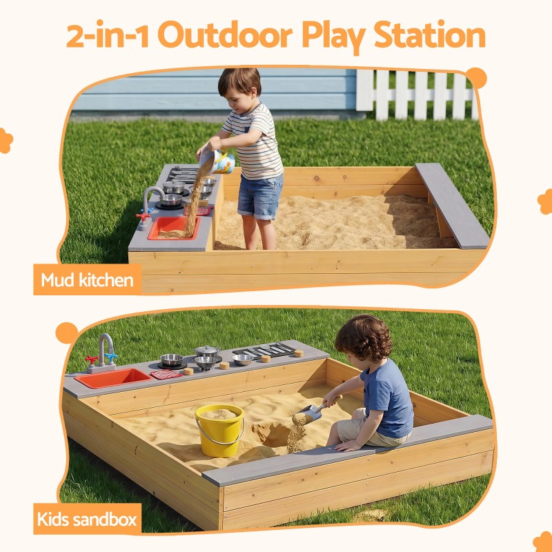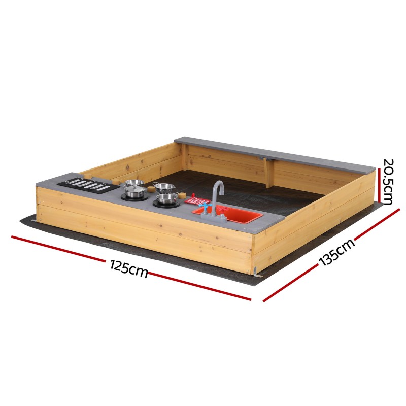 Spark outdoor imagination with the Keezi 2-in-1 Wooden Sandpit and Mud Kitchen. Made from weather-treated fir wood this versatile play station includes a realistic sink and tap removable sink bowl stove knobs for clicking action wide bench seats and a built-in shelf for toy storage. A protective ground sheet improves drainage and prevents weeds while rich accessories encourage sensory play and role play for Aussie kids.