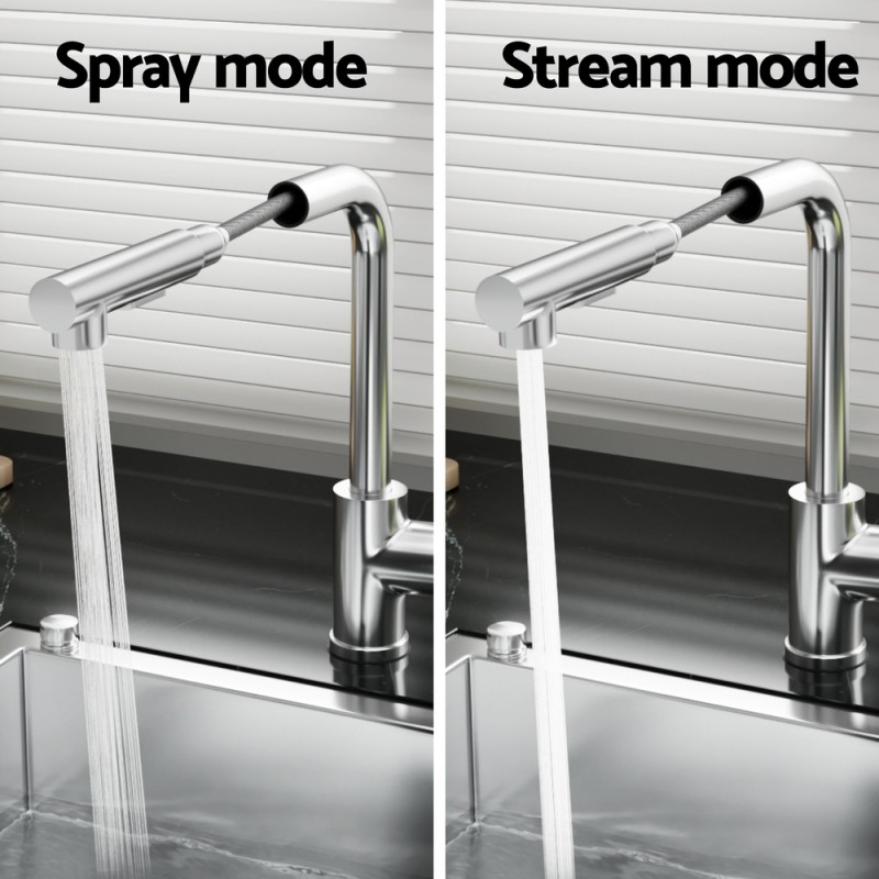 Upgrade your kitchen with the sleek, modern Kitchen Mixer Tap Pull Out Rectangle 2 Mode Sink Basin Faucet. Crafted from durable brass, 304 stainless steel, and ABS plastic, this tap features a pull-out spray, 360° swivel, and dual water modes for ultimate flexibility. The drip-free 35mm ceramic cartridge ensures reliable, long-lasting performance, while the matte black and silver finish adds a contemporary touch. Easy to install and Watermark and WELS certified, it fits sinks with 35, 38mm holes, perfect for any stylish kitchen.
