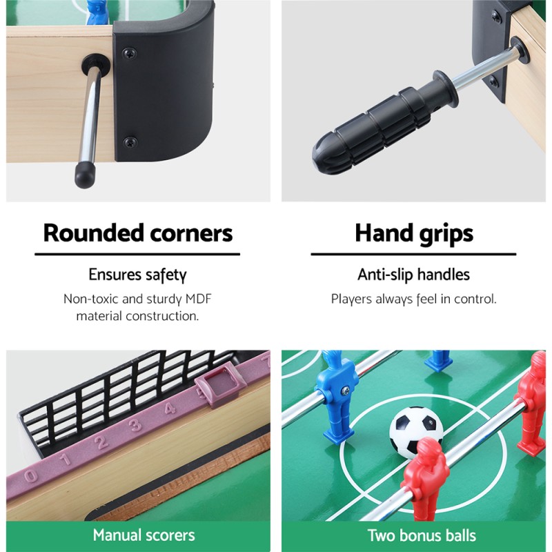 Host an unforgettable game night with the Mini Soccer Table Foosball Football Game. Perfect for enhancing your game room or adding excitement to your kids' space, this tabletop game promises hours of fun for all ages. Crafted from premium MDF board, it features sturdy players, chrome steel rods, and anti-slip handles for a realistic playing experience. Its compact, lightweight design makes it easy to transport, whether you're heading to a BBQ or a camping trip. Complete with a convenient scoreboard and goal box, this soccer table is your ticket to lively parties and memorable family bonding moments.