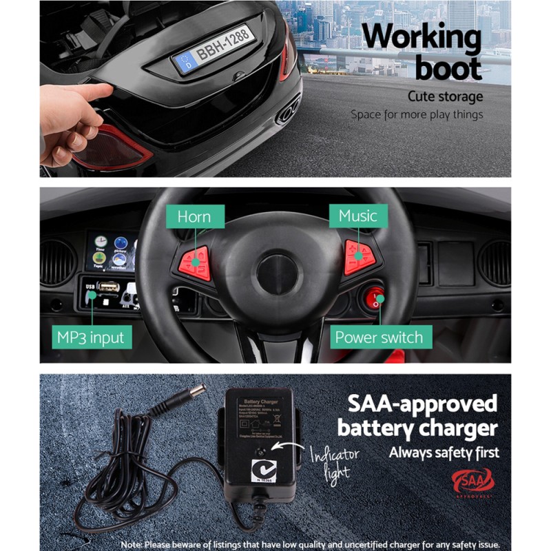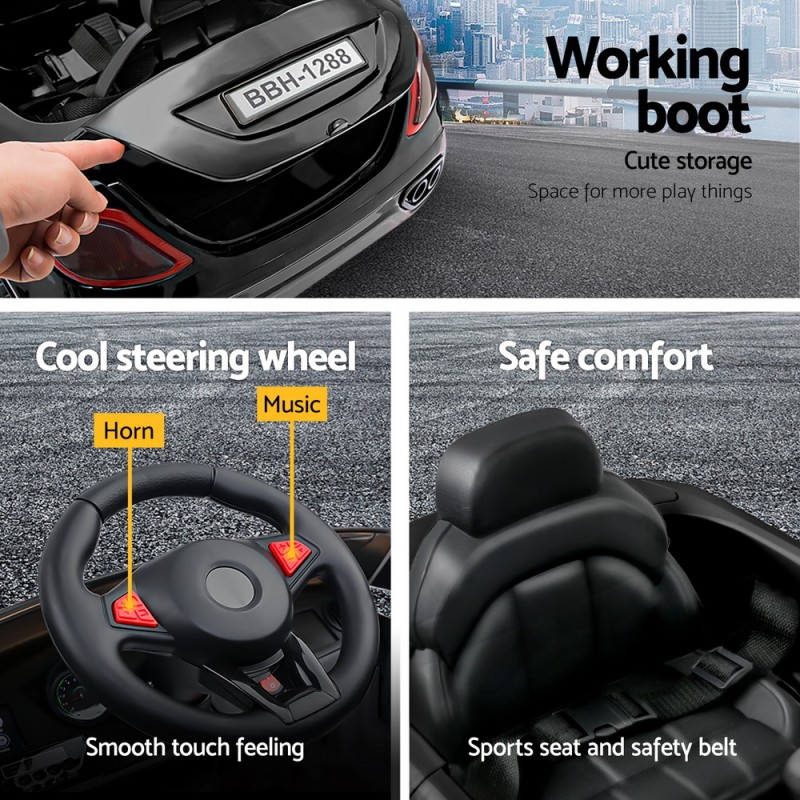 Let your child embark on thrilling adventures with the Rigo Kids Electric Ride On Car. Inspired by Maserati, this stylish ride offers a realistic driving experience with its steering wheel and acceleration pedals. It features twin motors, a lacquer finish, and keyless start. Safety is ensured with a seat belt, lockable doors, and parental remote control. With built-in music, anti-slip tyres, and a 4-wheel spring suspension, it's the ultimate gift for young car enthusiasts. Charge regularly to maintain battery health. Suitable for ages 3+, with a 1-year warranty.