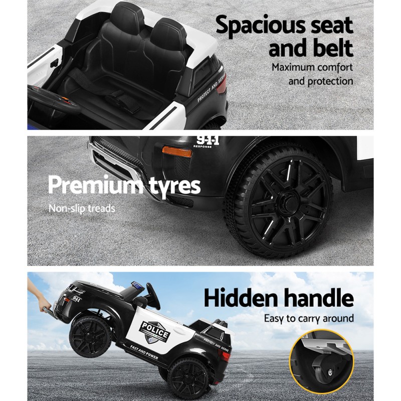 Let your child's dreams of being a hero take flight with the Rigo Kids Electric Ride On Patrol Police Car. This sleek ride offers a realistic driving experience with a responsive steering wheel and acceleration pedal. Equipped with a safety seat belt and remote control for parental oversight, this police car ensures both safety and fun. Its built-in music, horn, and flashing lights spark imagination, while the twin motors and keyless start add excitement. With a lacquer finish and anti-slip tyres, it's built for adventure. Perfect for children aged 3 and above, the Rigo Police Car is a thrilling way to explore the world.