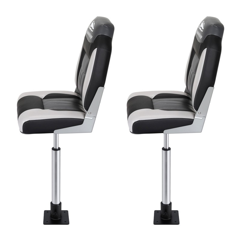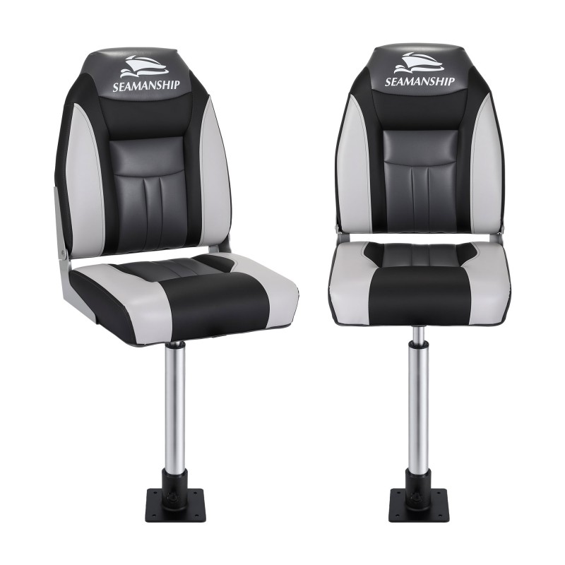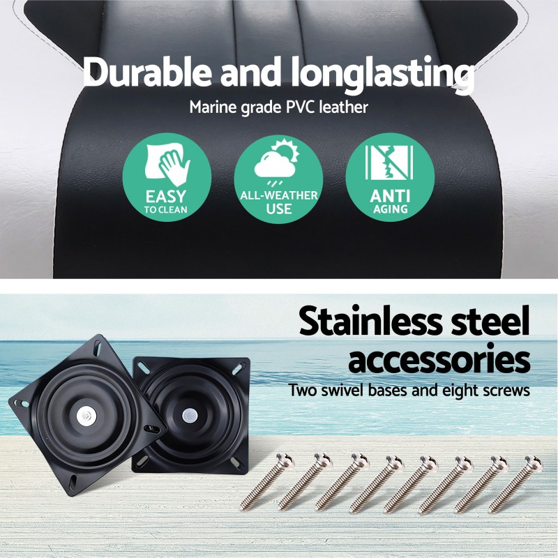 Upgrade your boat seating with this 2-pack of Seamanship folding seats complete with two adjustable 55–75cm gas lift swivel pedestals. Built for marine conditions with UV resistant PVC and premium plastics these seats feature XL high backs and 12cm high compression foam for comfort. Robust alloy hinges and stainless steel hardware provide long-lasting corrosion resistance while the 360° swivel and foldable design deliver practical onboard convenience and easy storage.
