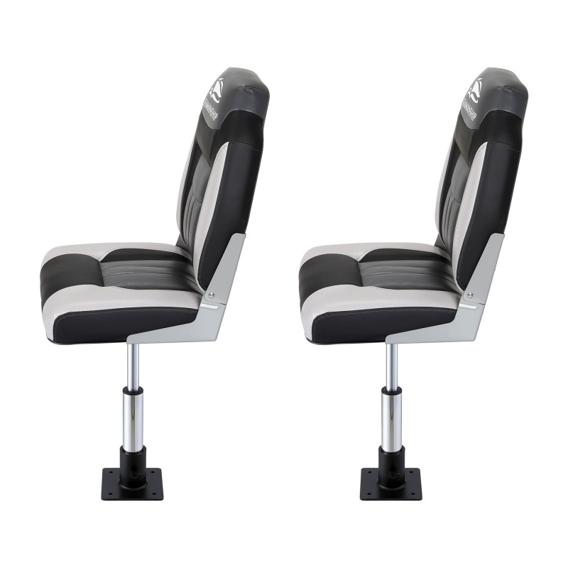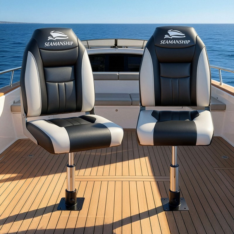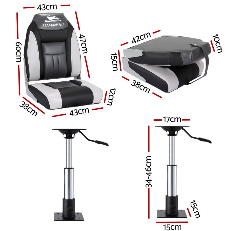 Enjoy stable comfortable seating on the water with this Seamanship 2‑pack of folding boat seats complete with two adjustable 34–46cm gas lift swivel pedestals. Built from UV resistant PVC and premium plastic with stainless steel hardware and alloy hinges these high back seats feature 12mm high compression foam and XL backrests for long days afloat. Seats fold away when not in use and the pedestals offer smooth height adjustment plus full 360° swivel for easy movement onboard.