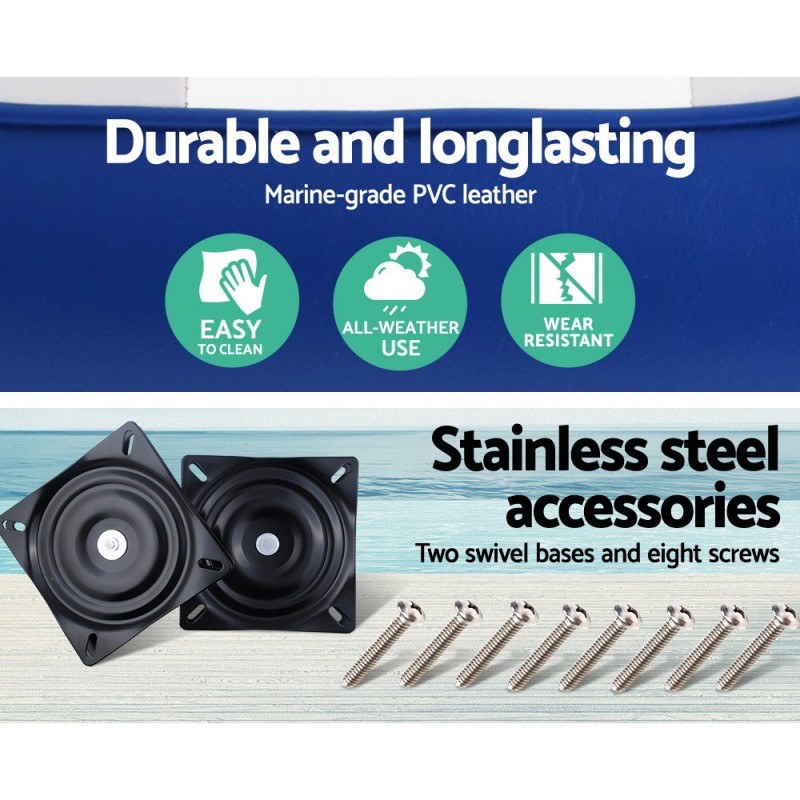 Upgrade your fishing boat with Seamanship's 2X Premium Foldable Boat Seats. Crafted from premium moulded plastic and UV-resistant PVC, these seats are built to withstand harsh weather and resist saltwater rust. Featuring a high backrest, 12cm thick high-compression foam padding, and a stylish grey/blue design, they offer comfort and durability. The robust alloy hinges and stainless steel hardware ensure longevity, while the swivel base provides versatile positioning. Enhance your boating experience with Seamanship.