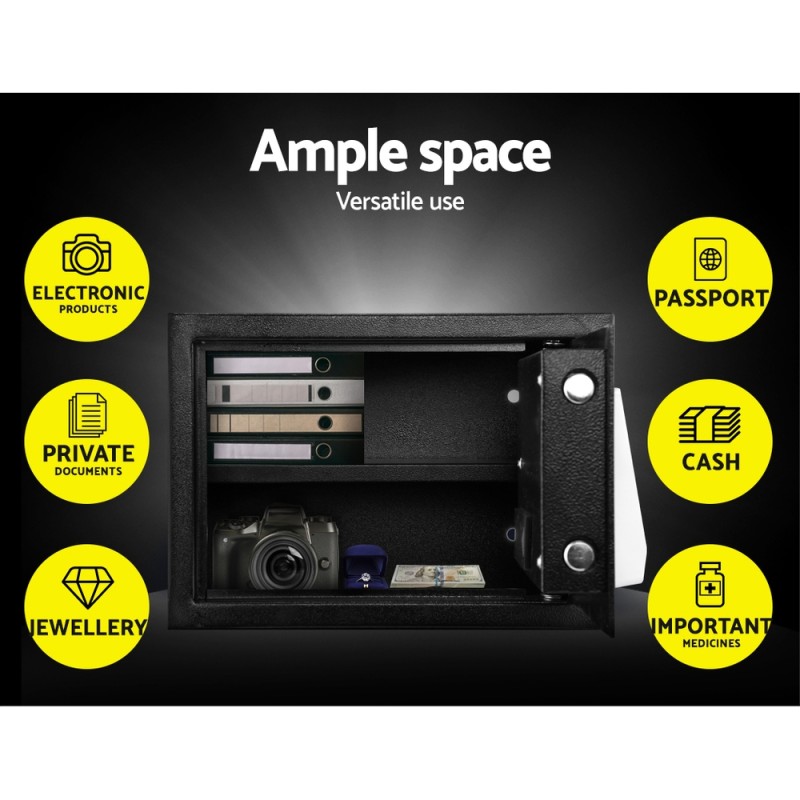 Secure your valuables with the UL-TECH Security Safe Box 16L. This robust safe features a solid, powder-coated steel frame with a thick door and sides, reinforced by a twin-bolt locking system and tamper-proof concealed hinges. Access is easy via a digital keypad or emergency key. Inside, a carpeted base offers space for jewellery, cash, and documents, while an alarm sounds after three incorrect entries. Versatile for freestanding or wall-mounted use, it promises peace of mind for your home or office.
