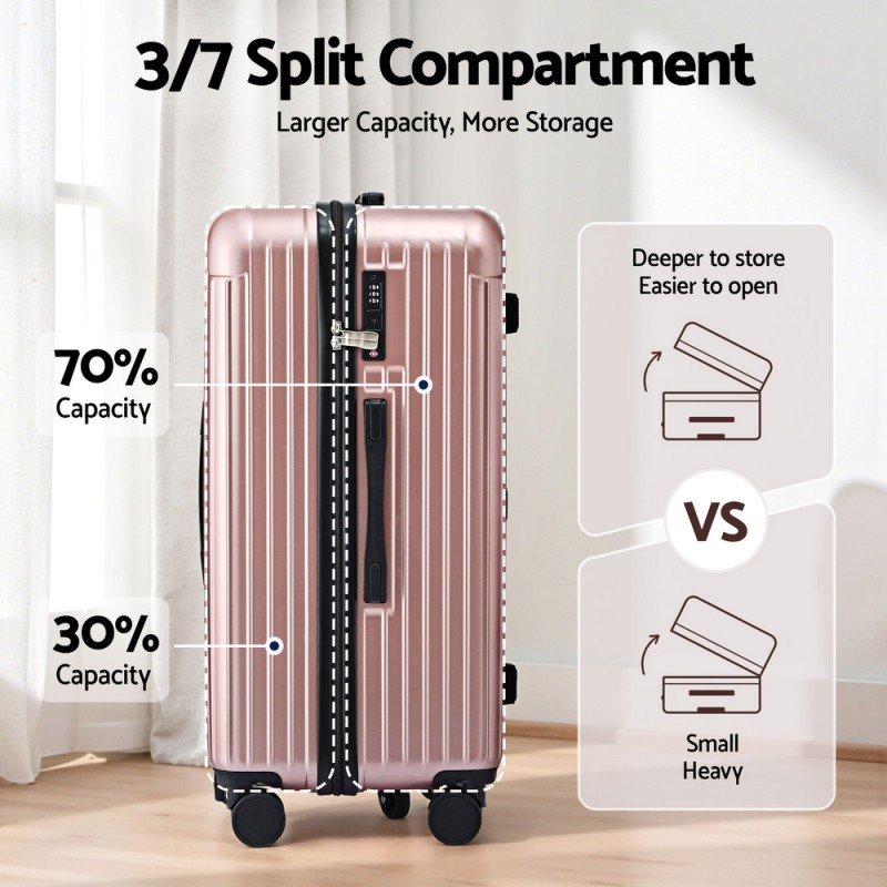 Embark on your next adventure with the Wanderlite 28" Trunk Luggage, a perfect blend of style and functionality. Designed in an elegant Rose Gold, this suitcase features a smart 3/7 split compartment that simplifies packing and ensures organisation. Stay connected on the go with built-in USB and Type-C ports, while reinforced 360° spinner wheels and an extra auxiliary wheel offer superior manoeuvrability. The sturdy ABS shell and TSA-approved lock provide top-notch security, and a hidden wet compartment keeps your belongings fresh. With spacious interiors, elastic cross straps, and multi-functional mesh pockets, Wanderlite ensures every journey is a breeze.