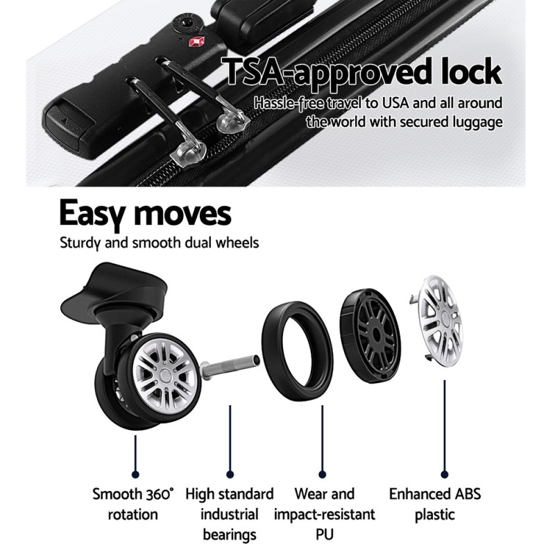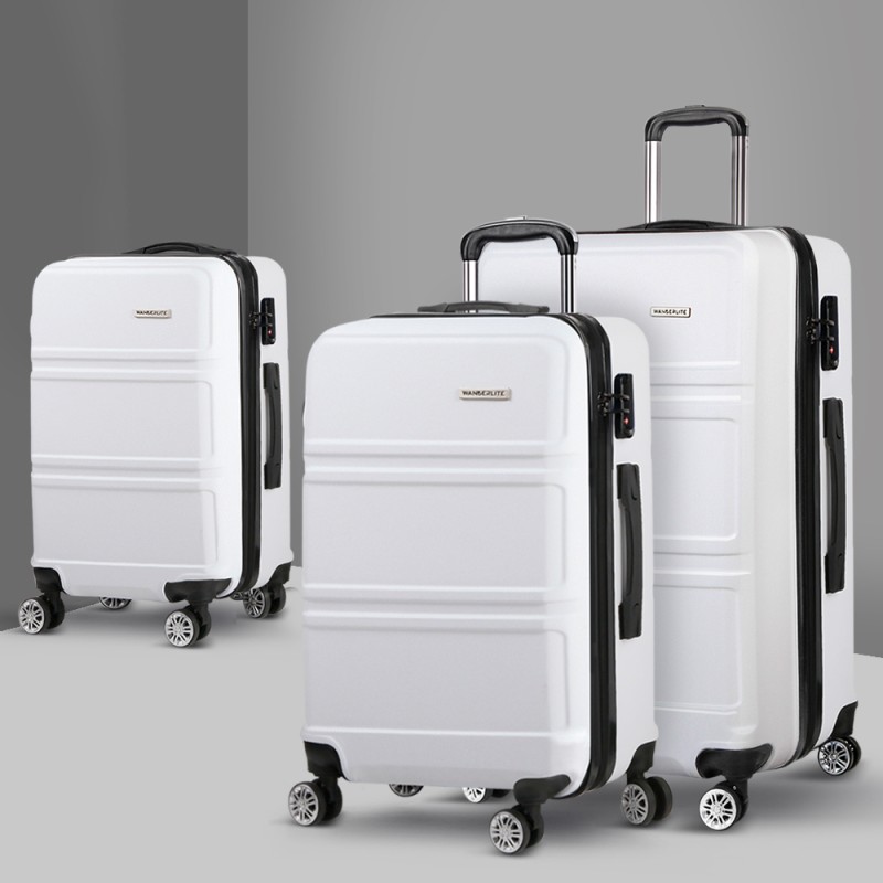 Travel with confidence and style with the Wanderlite 3pc Luggage Trolley Set. Featuring a lightweight, durable hard shell and smooth 360° dual wheels, this set ensures easy mobility. The TSA-approved lock provides added security, while corner protectors and a retractable aluminium pull rod enhance durability. With spacious interiors and secure X-straps, packing is a breeze. Available in sleek white, this set is your perfect travel companion, backed by a 1-year warranty.