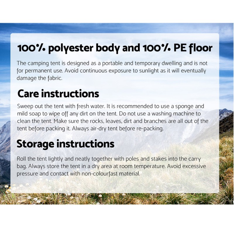 Experience effortless camping with the Weisshorn Instant Up Camping Tent, designed for 4 persons. This dome tent sets up in just two minutes, thanks to its pre-attached frame. Enjoy ample space and ventilation with large zipper doors and mesh windows that keep insects out. Suitable for all seasons, its PU water-resistant coating and thick base ensure protection from the elements. The tent comes with a convenient heavy-duty carry bag, making it perfect for year-round adventures.
