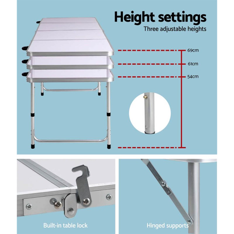 Lightweight and portable, the Weisshorn Folding Camping Table is your ideal companion for outdoor escapades or as supplementary household furniture. Crafted from strong aluminium, this table supports up to 40 kg and features a spacious, rust-resistant MDF top. With three adjustable heights of 54cm, 61cm, and 69cm, it suits various environments. Rounded corners ensure safety, while a carry handle offers convenience. Enjoy easy setup with no assembly required, making it perfect for kitchens, patios, gardens, and camping trips.