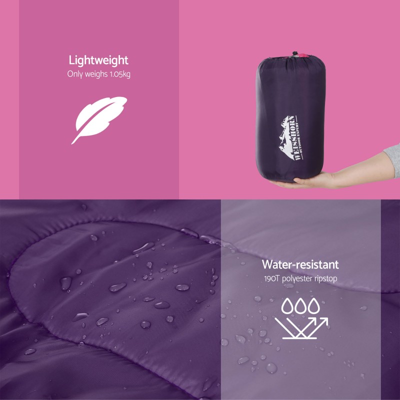 Make every family camping adventure memorable with the Weisshorn Sleeping Bag Set of 2 Kids Single 172cm Thermal. Designed for warmth between -5°C and 20°C, each sleeping bag features a soft 250gsm hollow fibre filling, cosy polyester pongee lining, and a water-resistant ripstop shell. Lightweight, colourful and easy to carry, these sleeping bags are perfect for chilly nights or as a comfy mat for playtime outdoors. Pack includes one pink and one blue bag, each with its own carry bag for convenient transport.